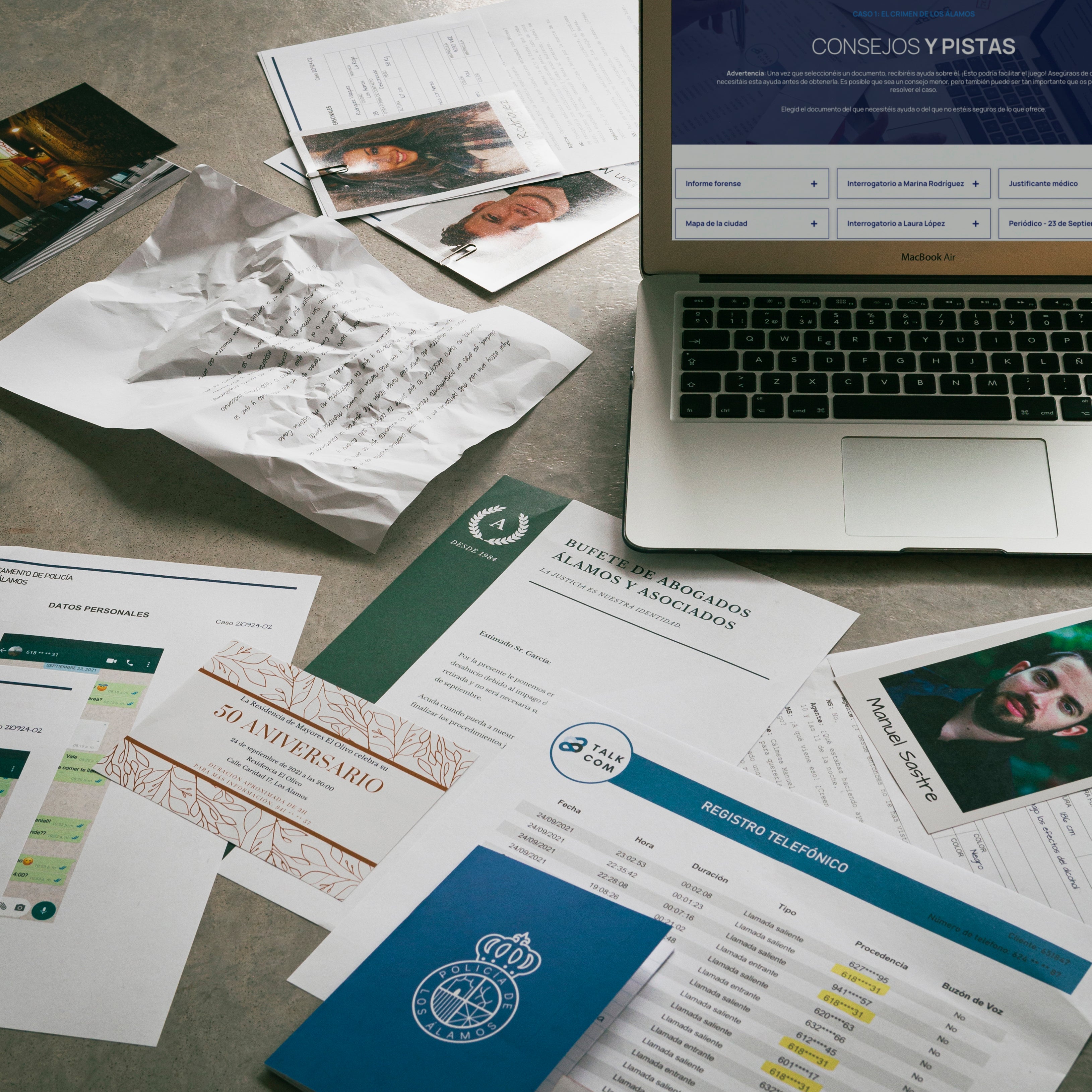 Ponte en la piel de un investigador para resolver el crimen de Los Álamos. ¿Serás tan bueno como los detectives de la televisión? Para resolver este caso de asesinato tendrás que encontrar la respuesta a estas dos preguntas, ¿Qué oculta la mejor amiga de Nerea? y ¿Quién mató a Nerea? Comprueba todos los documentos, crea líneas temporales y confirma las coartadas para resolver el escape room.